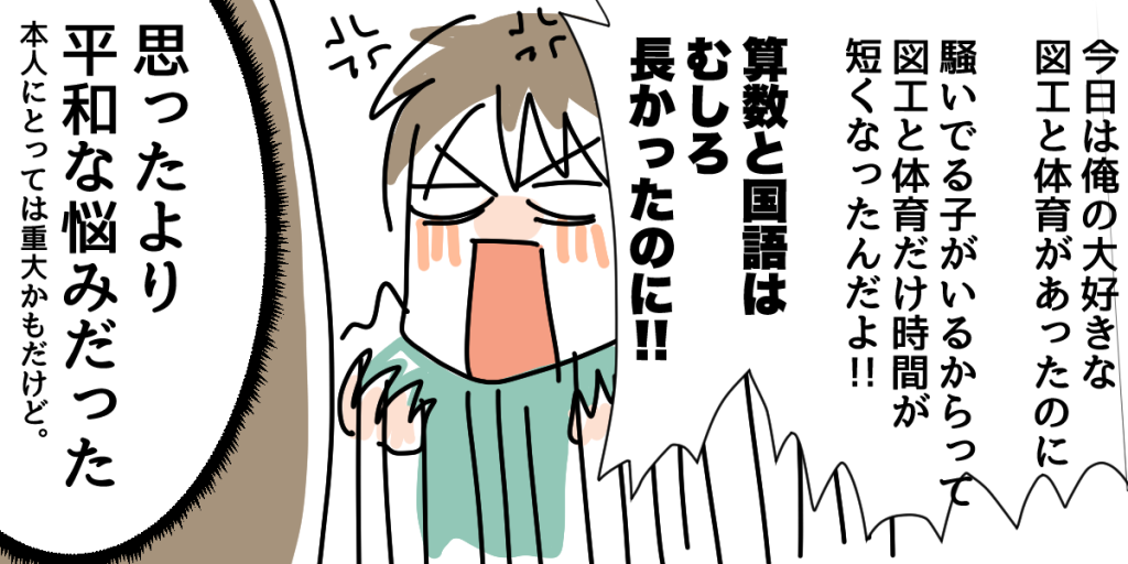【長男7歳】続・小学2年生の悩み 長男 7歳 X Facebook はてブ コピー 2022.04.22↓昨日の話のちょっとした続きです 【長男7歳】小学2年生の悩み担任の先生がベテランから新任になって、荒れるクラスの様子にムスコが悩んでいました。昨日の夜、長男から「学校のクラスが荒れてて嫌だ」という相談を受けたのですが、その翌日も「また昨日みたいに相談したいことがあるんだけど」と言われました。(おやっ…何かあったかな…もしかして騒いでる子とトラブルがあった…!?)などと悪〜い方に考えて身構えてしまったのですが、「好きな授業が短くなる!!」という割と平和な悩みでした。まぁでも小学校の時って好きな授業のために学校行ってる部分もあるので、これはこれで死活問題ですよね。