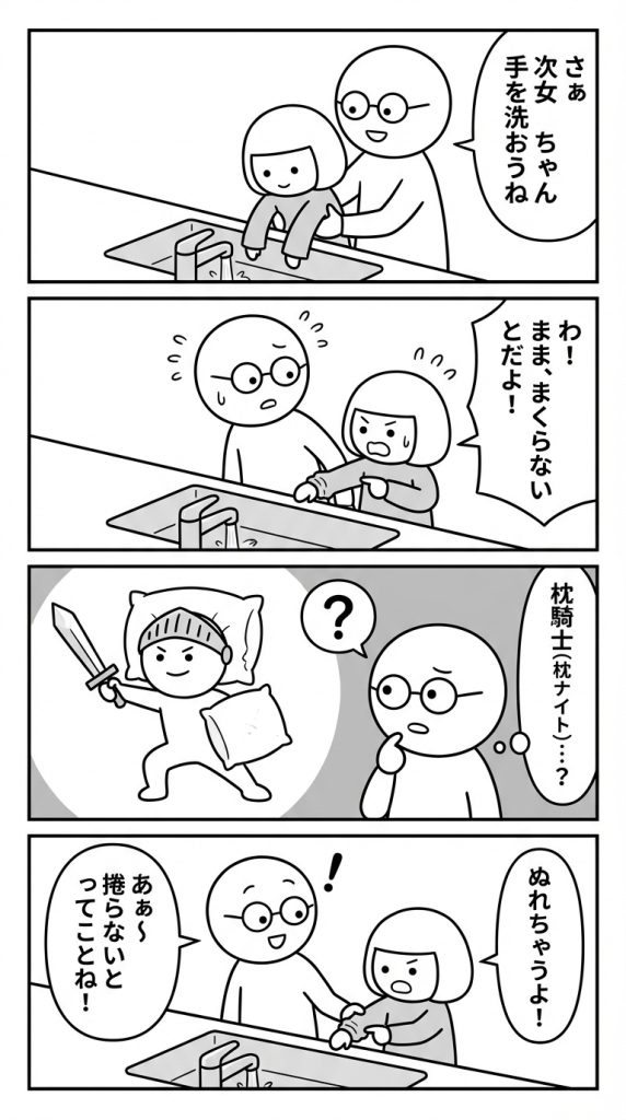 「まくらないと!まくらないとだよぉ〜!!」と連呼して頑なに手洗いを拒否する次女に「何言ってるかわからないよ〜手を洗わなきゃダメだよ〜!」と返しながら「枕ナイト…枕騎士…??なに?なにそれ??」と思ってました。